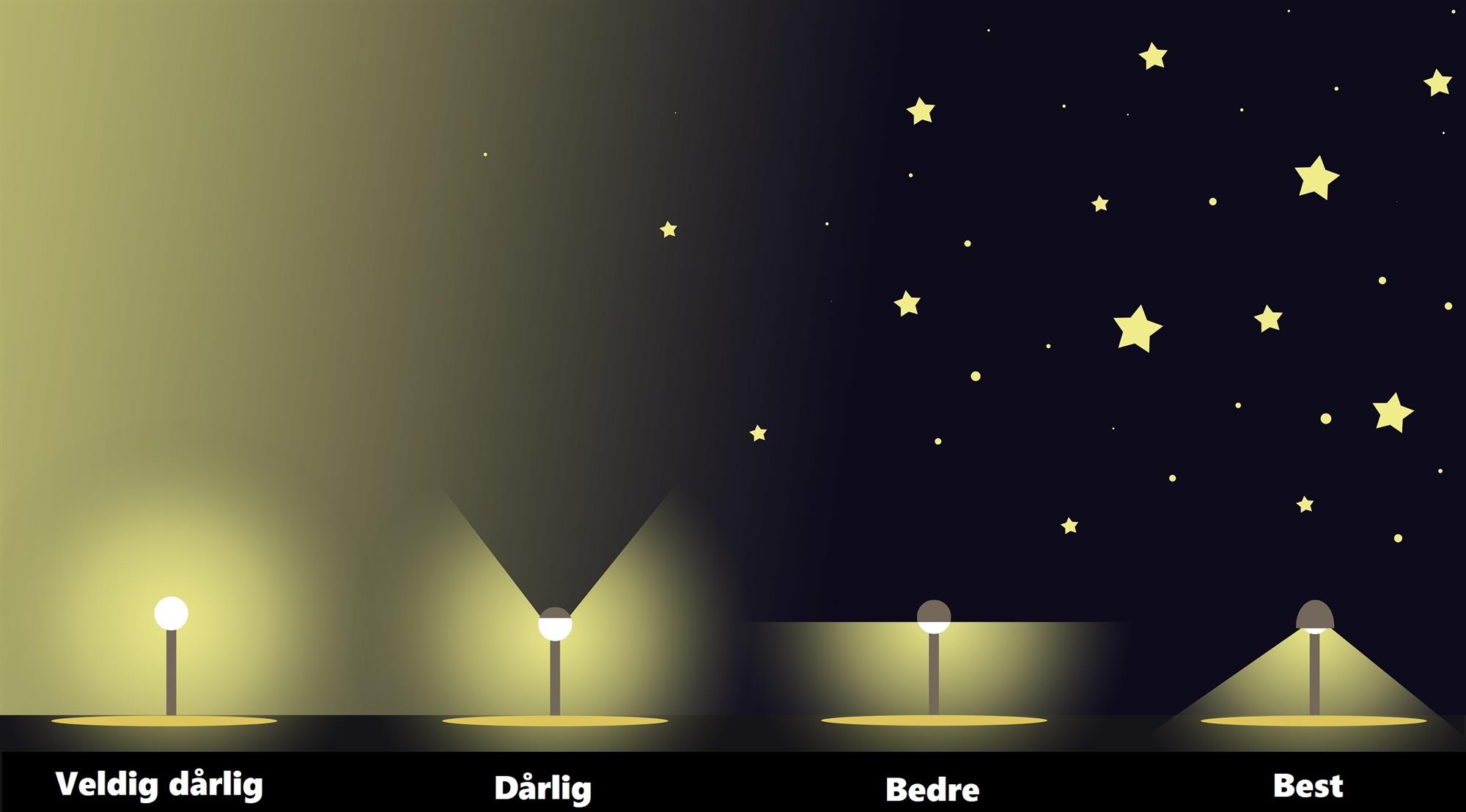 For å begrense mengden av lysforurensning, kan du bruke lysarmaturer som bare retter lyset nedover, ha lysstyrken på laveste nivå og ikke sette opp flere lyskilder enn du trenger. Vær bevisst på disse tingene, så får vi en litt bedre verden.